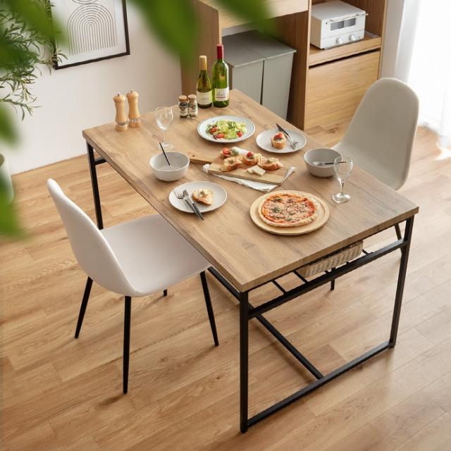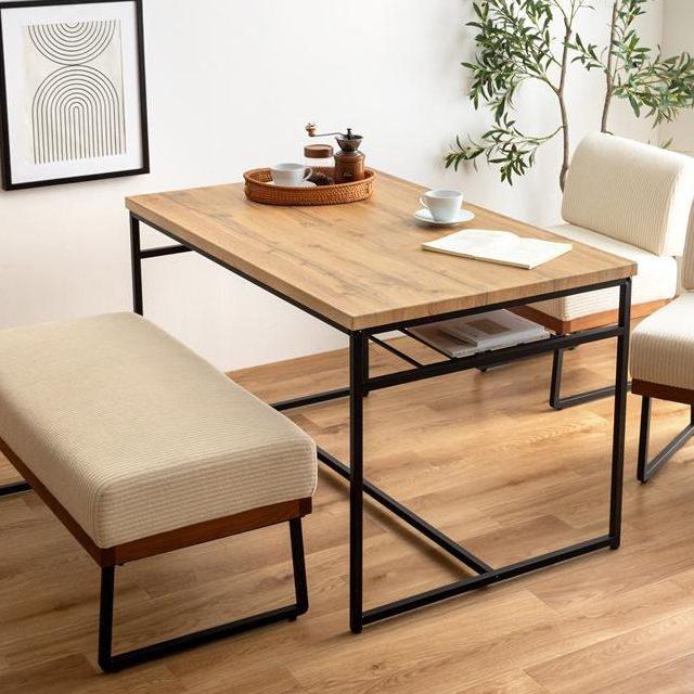 温もりを感じる木目調の天板とスタイリッシュなアイアン脚が、まるでカフェのような落ち着いた空間を演出します。