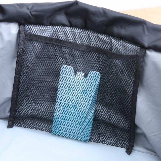 保冷剤を入れられるポケット付きで、冷たい状態をしっかりキープ。買い物やレジャーでも安心して持ち運べます。またこだわりの4層構造で、インナー生地にはEVA素材を採用しています。水を通さず、汚れが染みにくい仕様です。
