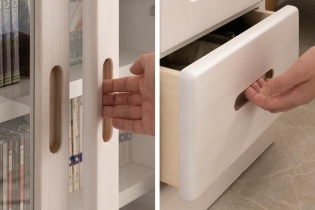 天然木ならではの取っ手の掘り込み加工で一体感があります。扉部分は縦に、引出し部分は横に彫り込まれており、指の引っかかりがよく開閉がしやすいです。取っ手が出ていないので、スッキリとした見た目です。