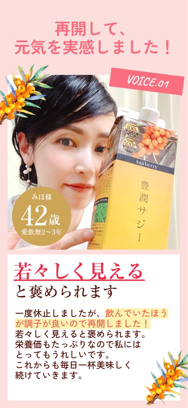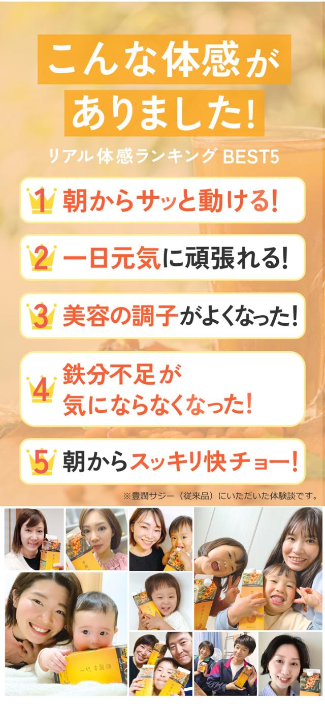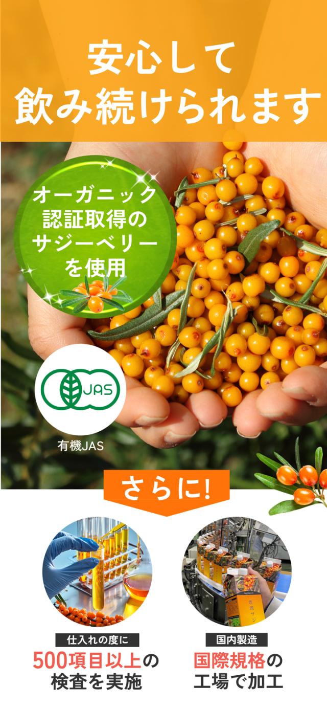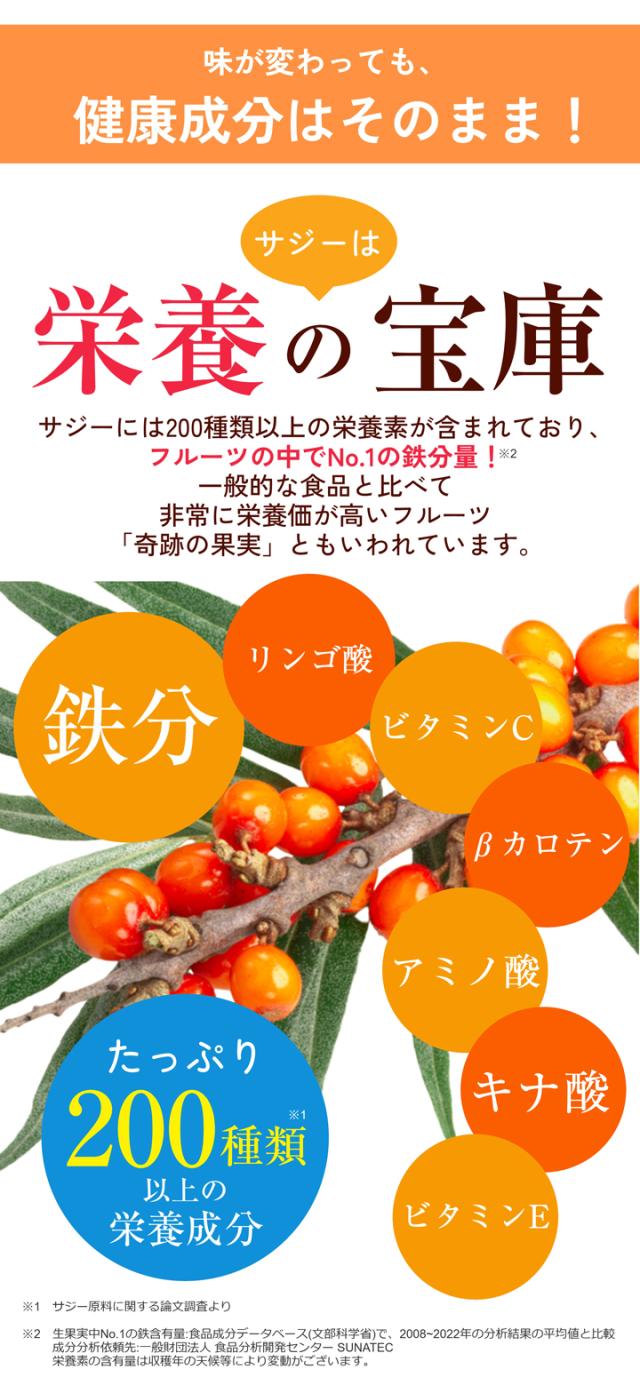 | 原材料 | サジーピューレ(中国(内モンゴル自治区)製造)、食物繊維、みかん濃縮果汁/甘味料(キシリトール、ステビア)、香料 |