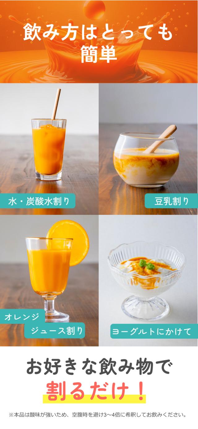 | ご注意 | ・ 酸味が強いため、空腹時を避け3〜4倍に希釈してお飲みください。 ・食品アレルギーの方、お薬を服用中の方、通院中の方は医師に相談してください。 ・体質や体調に合わない場合はご使用を中止してください。 |
