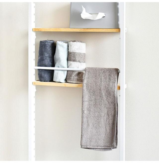 浮かせる収納が可能なこのラックは、つっぱり式で設置も簡単。