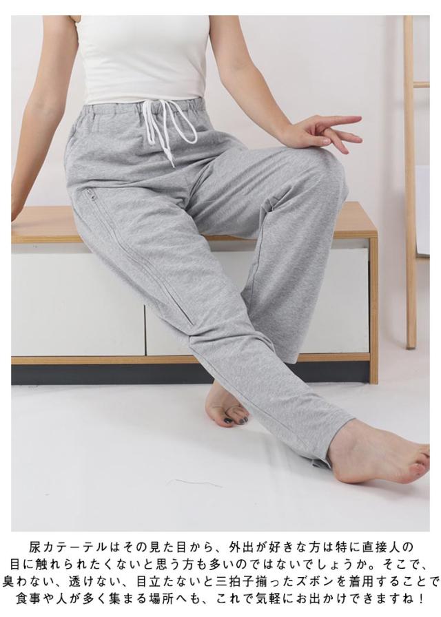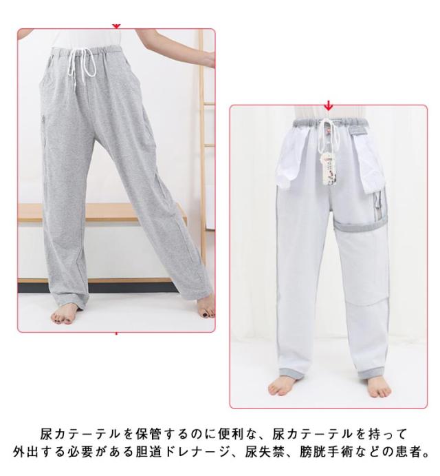 | 着脱が簡単な失禁パンツ。 洗濯機で洗え、お手入れも簡単、体重の重い大人でも扱いやすい失禁パンツは、不要な手間を軽減します。 尿カテーテルは左右に2つずつ収納でき、尿カテーテルはズボンの中に隠れるので、どんなシチュエーションでも1人で使えて恥ずかしくないので便利です。 尿カテーテルを保管するのに便利な、尿カテーテルを持って外出する必要がある胆道ドレナージ、尿失禁、膀胱手術などの患者。 尿カテーテルはその見た目から、外出が好きな方は特に直接人の目に触れられたくないと思う方も多いのではないでしょうか。そこで、臭わない、透けない、目立たないと三拍子揃ったズボンを着用することで食事や人が多く集まる場所へも、これで気軽にお出かけできますね! | |
