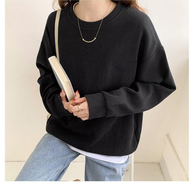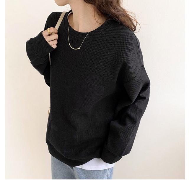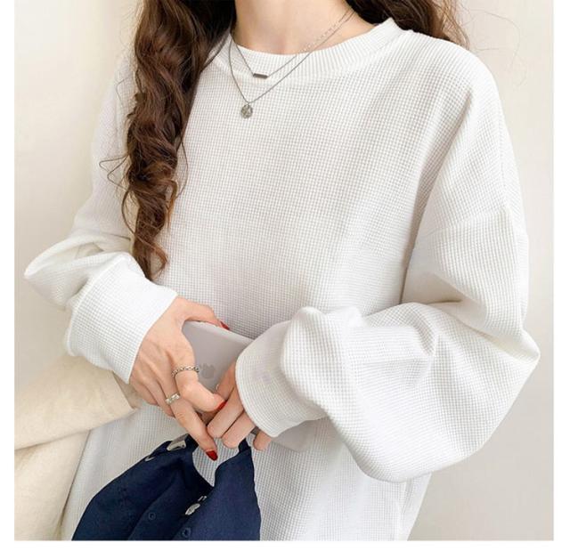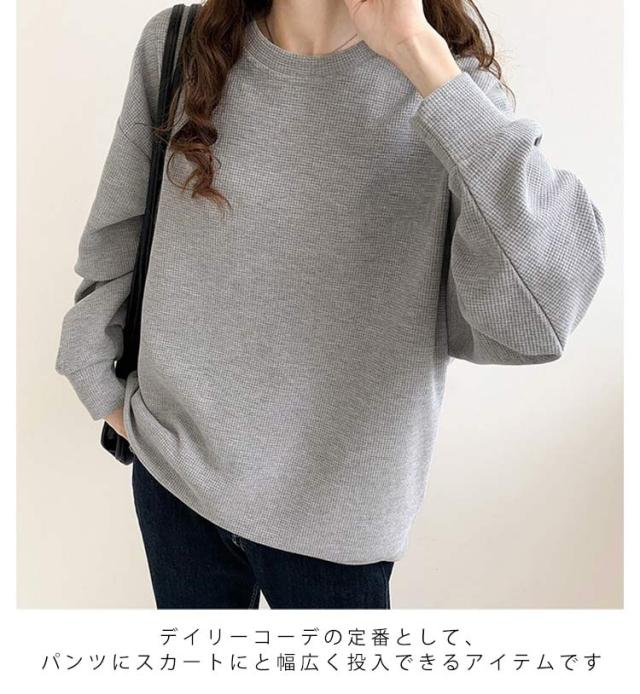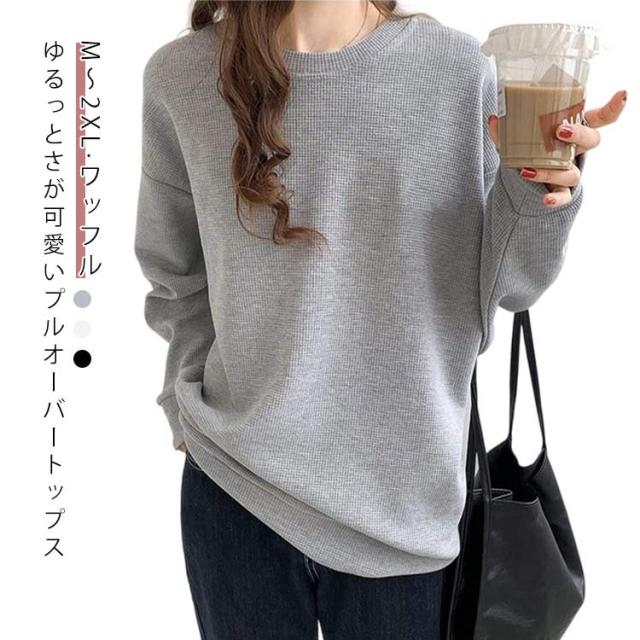 カットソー レディース ブラック 黒 体型カバー 秋 ワッフル ドロップショルダー ワッフル トップス 韓国 大きいサイズ カットソー 春 白 グレー 長袖 ホワイト プルオーバー シンプル カジュアル トレーナー Tシャツ