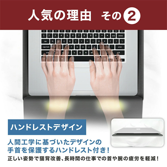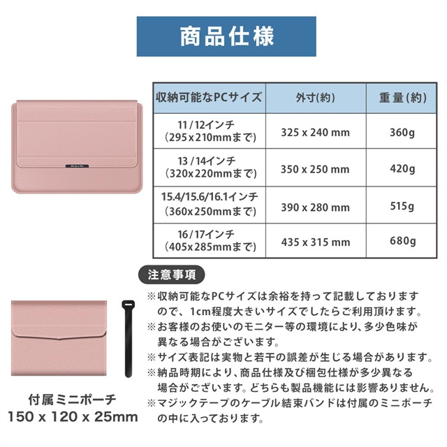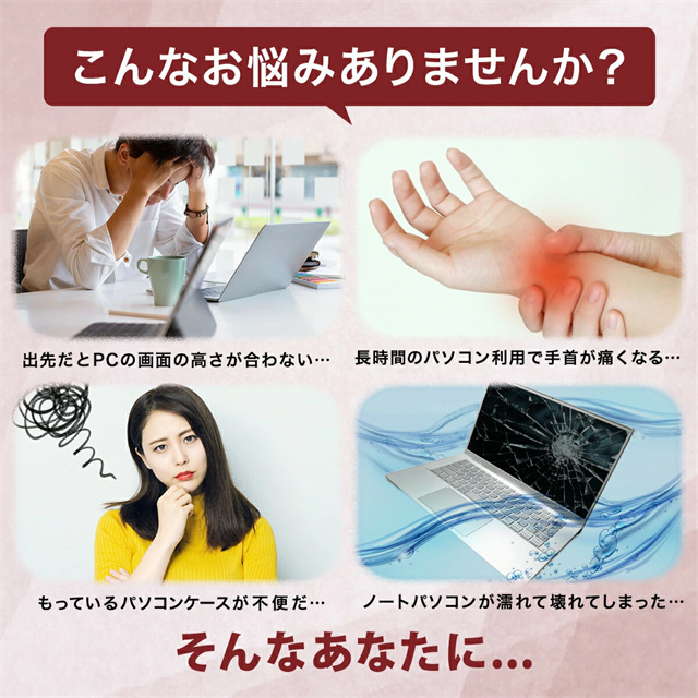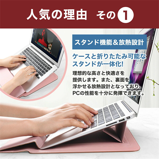 | 製品特徴 | ハンドレスト付きパソコンケーススタンド! 11〜17インチ対応! 7カラー! 【スタンド機能&放熱設計!】 ケースと折りたたみ可能なスタンドが一体化! 理想的な高さと快適さを提供します。 また、裏面を浮かせる放熱設計となっており、PCの性能を十分に発揮できます。 【ハンドレストデザイン!】 人間工学に基づいたデザインの手首を保護するハンドレスト付き! 正しい姿勢で猫背改善、長時間の仕事での首や腕の疲労を軽減! 使いやすい開閉マグネット! 保護ケースの蓋とケースにマグネットを採用! ストレスなくかんたんに開閉可能! 【多目的アクセサリー収納ミニポーチ付属!】 電源ケーブルや、マウス、スマホ、モバイルバッテリー、名刺などの小物を収納できます。 便利なケーブル結束バンド付き! 充実のスペック! 【撥水加工】 撥水加工された高級フェイクレザーを採用。 防水性と防滴性で大切なノートPCを守ります。 【PCを保護する素材】 特注の上質フェイクレザーを採用。 従来のフェイクレザーより約30%薄く軽量。 生地がきめ細かく、耐久性にも優れているのが特徴です。 【4サイズ展開】 お手持ちのPCサイズに合わせられる4サイズをご用意。 丁度いい厚みと軽さで、持ち運びもらくらく快適。 |