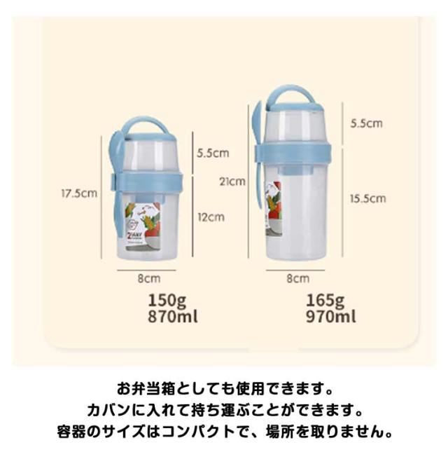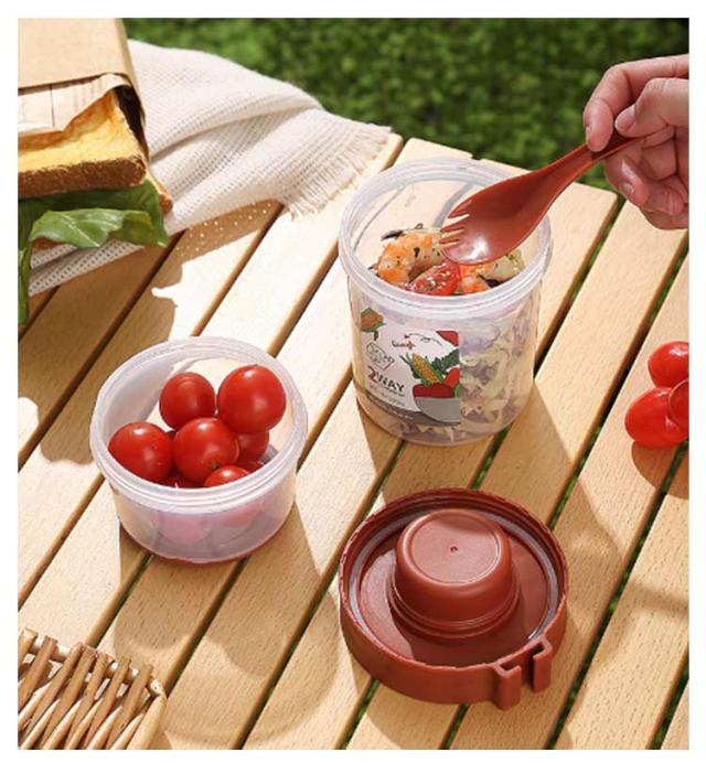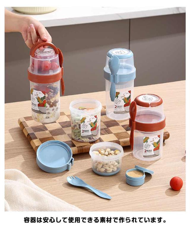| 容器はボトル型で、持ち運びに非常に便利です。サラダ、フルーツ、スナック、牛乳などに使用できます。 ソースカップとフォークが付属しています。 カップ本体は透明で中の食べ物がよく見えます。 容器の上部にはドレッシングを入れるカップが付いています。 容器は安心して使用できる素材で作られています。 フタを閉めると、シェイクしてドレッシングを混ぜることができます。 容器はお弁当袋に入れやすいサイズです。 ピクニックや外出先での使用に最適です。 便利でスタイリッシュなデザインです。 手で持ちやすい形状です。 お弁当箱としても使用できます。 カバンに入れて持ち運ぶことができます。 容器のサイズはコンパクトで、場所を取りません。 | |