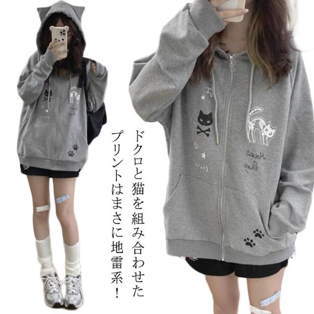 | ドクロと猫を組み合わせたプリントはまさに地雷系! 着るだけで地雷系&量産型のスタイルを実現! 生地が柔らかくて履き心地が良い フードがとても可愛くて、ゆるっとかぶるのが気持ちいい | |