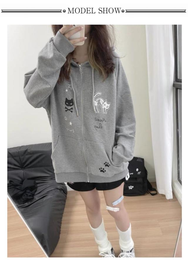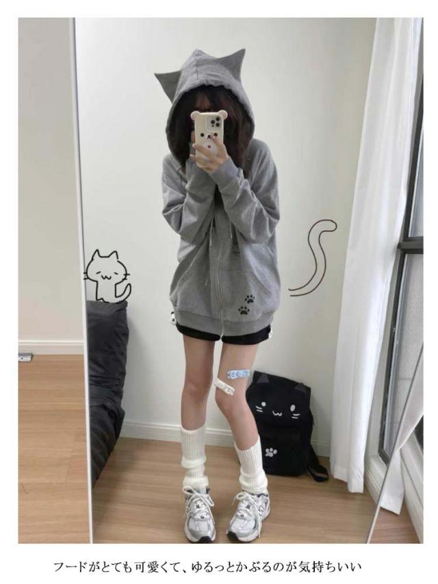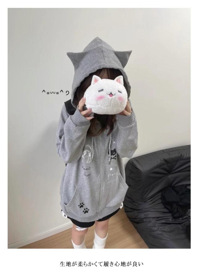 フード付き 猫耳 スウェット パーカー 猫耳パーカーレディース 長袖 トップス 薄手 トレーナー アウター ジップパーカー サブカル系 ストリート系 カジュアル 原宿風 プリント おしゃれ 可愛い 猫耳パーカーレディース 学生