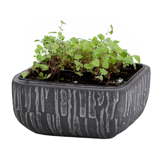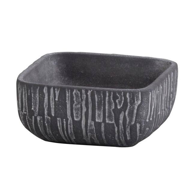 木の幹みたいに縦に粗く削ったような模様のセメントポットです。黒すぎず、おしゃれな色味と模様に陰影が高級感を演出してくれます。幅15.5×奥行15.5cmでデスクや棚の上に置ける観葉植物におすすめです。
