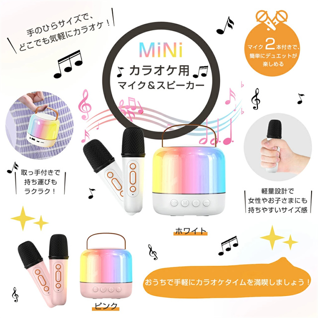 送料無料 冬新作 ミニ カラオケマイク 2本付きカラオケセット 小型 持ち運び マイク スピーカー 変声機能 カラオケ ワイヤレス ボイスカット マジックボイス ポータブル Bluetooth 家庭用 ホームカラオケ 多彩LEDライト付き 高音質 音楽再生
