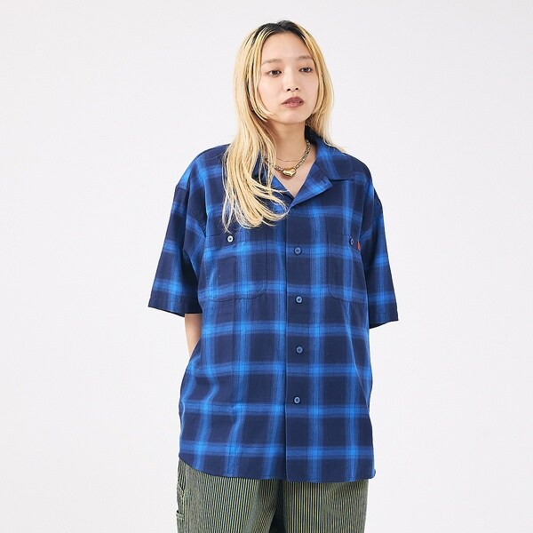 オンブレチェックのオープンカラーシャツ。トレンドのオンブレーチェックはシンプルになりがちな夏のコーディネートのアクセントとなり、1枚ではもちろん織としても着こなすことができます。