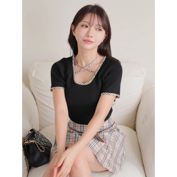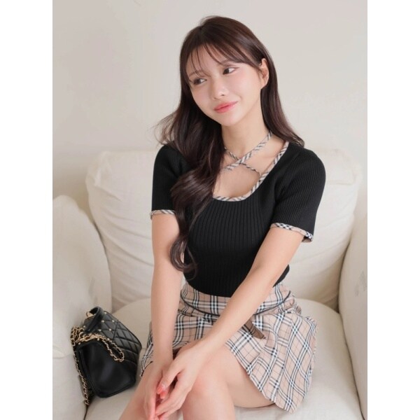 000453010260 / チェックパイピングハーフリブニット