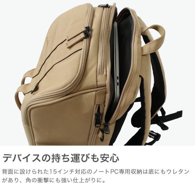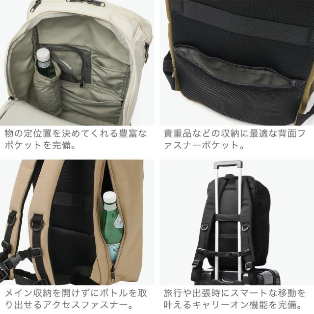 | 仕様 | <外側> ポケット×3 PC収納×1 <内側> ポケット×5 PC収納×1 ボトルホルダー×1 |