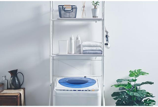 洗濯機上のスペースを使って、日頃使う日用品をスッキリ収納。