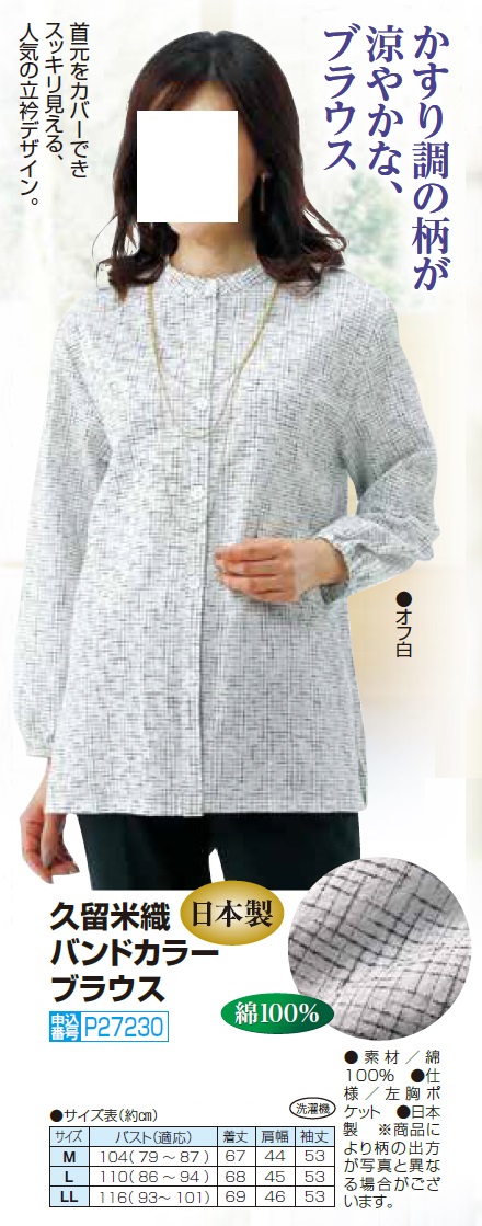 日本製 久留米織バンドカラーブラウス ホワイト ブラウス バンドカラー 長袖 レディース 婦人服 ミセス シニア 女性 白 久留米織り くるめ織り かすり シンプル シニアファッション 40代 50代 60代 70代 80代 90代 母の日 お母さん 春物 夏物 春夏 natu p27230