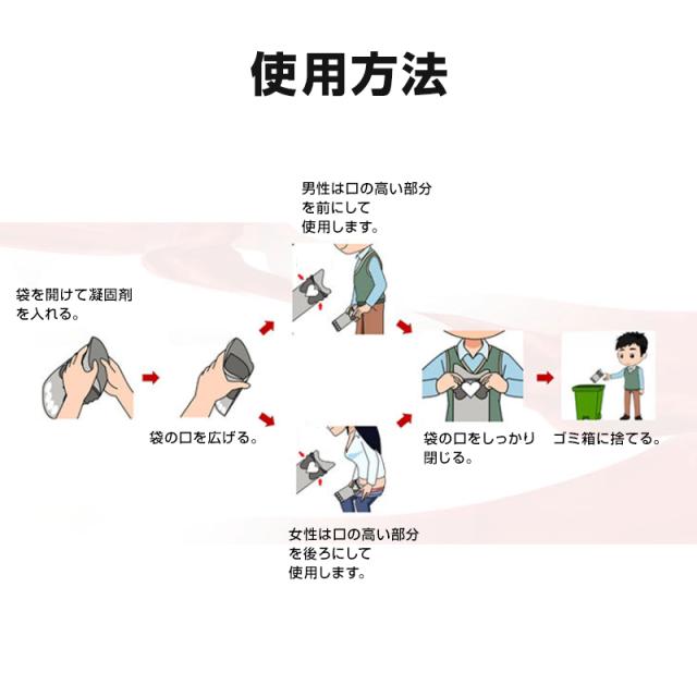 袋を開けて凝固剤を入れ、口の高い部分を前(男性)または後ろ(女性)にして使用。
