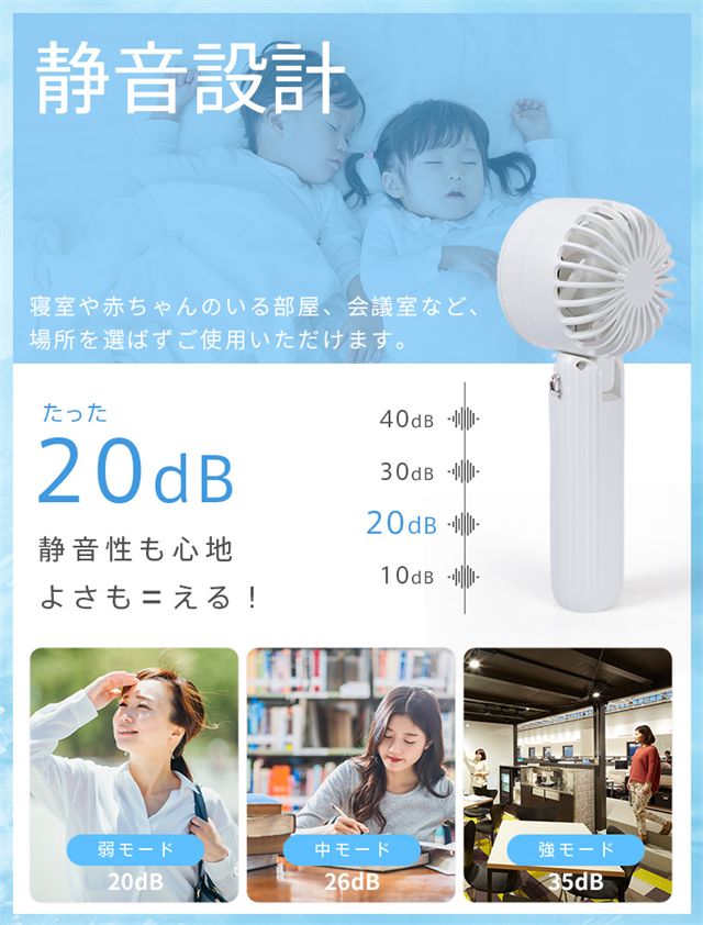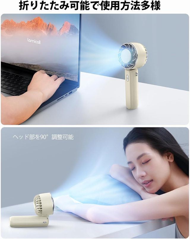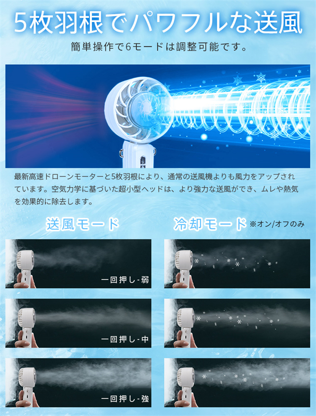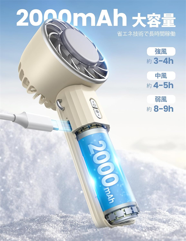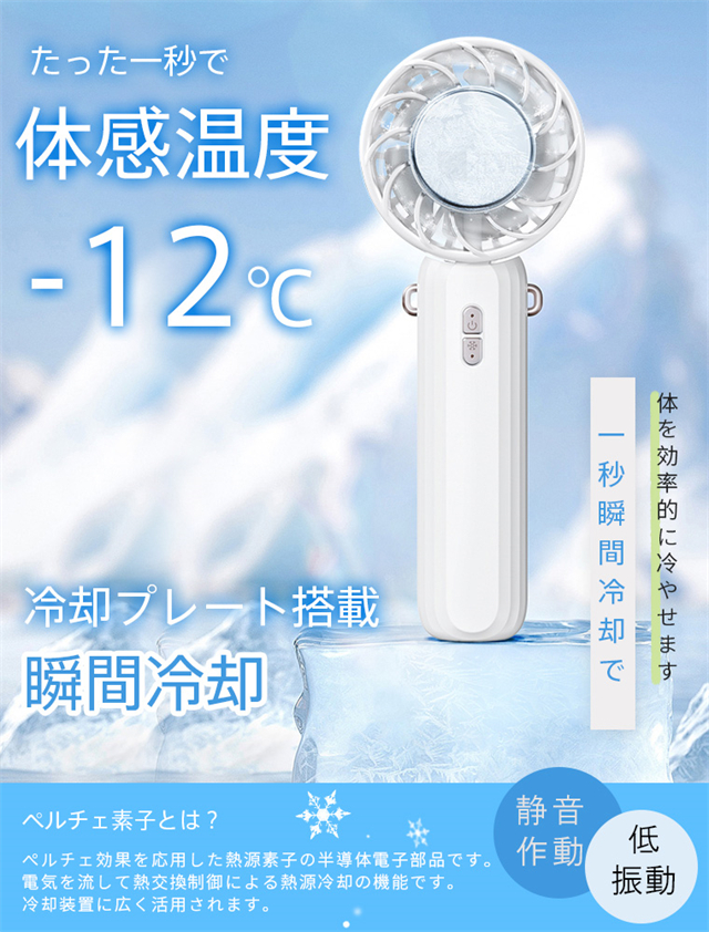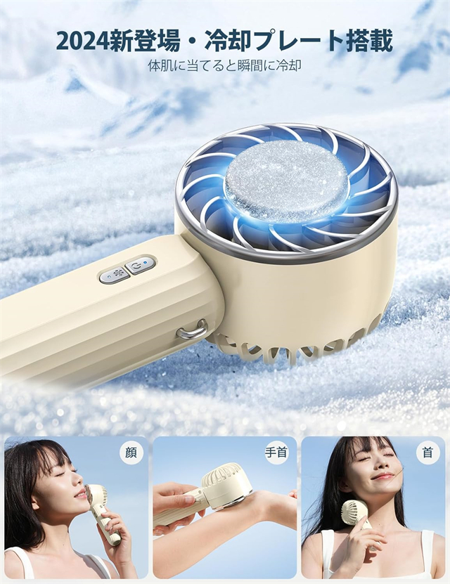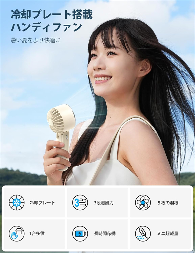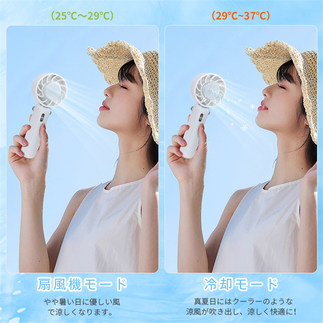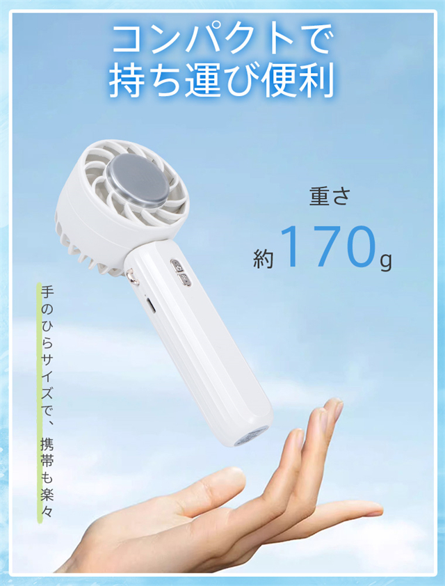| 特徴 | ◆【ベルチェ半導冷却プレート・熱中症対策】ハンディファンはベルチェ半導冷却プレートを搭載、暑い夏には冷却機能をオンにして、冷却プレートを首、額、手首などに貼り付けるだけで、心地よく氷のような冷たさが感じられます。 夏には欠かせない便利なアイテム。???注意:冷却機能は送風機能使用後にのみ使用可能で、単独では使用できません。また、冷却機能を作動させるには、冷却ボタンを押す必要があります。冷感不要の時は取り消すことでより長時間稼働可能。???冷却効果は肌への冷却のみで、送風を冷風にすることはできません。??? 【3段階風量調節・強力送風】ハンディ扇風機は空気力学に基づいたデザインにより、小型なのに送風は強い。5枚の羽根が搭載されて効率的に送風することができます。3段階の風量が調節できますので、強風で暑い夏でも涼しくなります。電源ボタンを押すだけで風量を変えることができます。 【手持ち/首掛け/卓上3in1ミニファン】携帯扇風機は手持ち扇風機・卓上扇風機・首掛け扇風機3つの機能を同時に兼ね備えています。ミニファン本体はストラップが付属しています。扇風機を使用しない時、首に掛けて両手を解放できます。また、扇風機のヘッド部は90°調整可能です。両手で持つことなく、首からぶら下げて顔に冷風を当てられる。長時間使っても疲れにくい。 【Type-C充電式・長時間稼働】?ミニ扇風機はUSBポートを搭載、多様な充電方法に対応、パソコンや充電器、モバイルバッテリーで充電可能で、送風しながら充電も可能で、お出かけ時も安心です。2000mAhのバッテリーの容量で、弱風量は最長8.5時間作動可能です。???注意:過度の充電電圧はバッテリーを損傷する恐れがあります。 5V-2Aの充電プラグをご使用ください。急速充電プラグの使用は避けてください。 【コンパクト・持ち運びやすい】手持ち扇風機はコンパクトで、わずか170gの重さ。女性にも長時間持っていても疲れません。コンパクトでバッグに収納するのも便利です。旅行・通勤・通学。・買い物・お出かけといった普段使いでのマスク装着時の蒸れ解消はもちろん、アウトドアでの暑さ対策や熱中症対策にも一役買ったりと、いろいろなシーンで使えるのが魅力です。 |