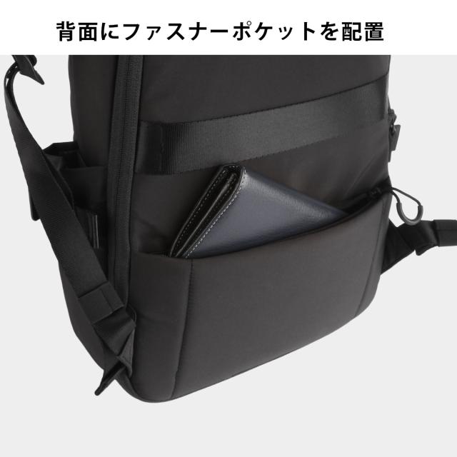 背面にファスナーポケットを1ヵ所配置。長財布がしっかり収まるサイズ感です。