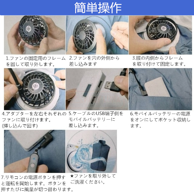 | 【空調ウェアの使用】 | ◆様々なシーンで幅広くご活用できます。 ◆夏場の戸外イベントやサイクリング、釣りや高温環境の作業(工事現場、交通誘導)などに大活躍します。 ◆体感温度を急速に下げられ、熱中症対策グッズとなります。 |