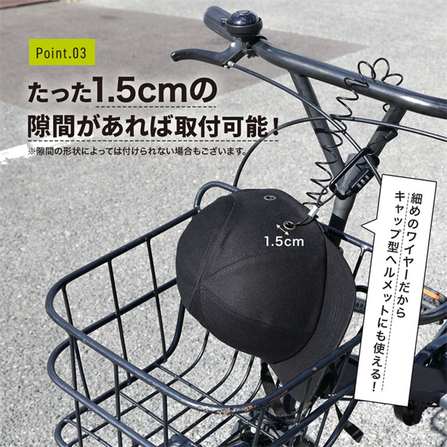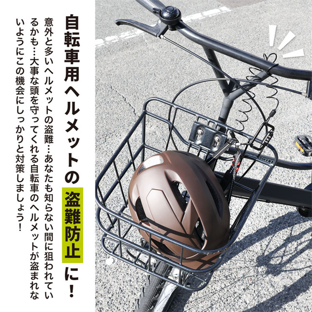 | 商品説明 | 自転車用ヘルメットの盗難防止に便利なヘルメットロックです。 意外と多いヘルメットの盗難被害。あなたも知らない間に狙われているかも… 大事な頭を守ってくれる自転車ヘルメットが盗まれないように、この機会にしっかり対策しましょう! ・自由度が高いワイヤー式なので、自転車のハンドルやかごに取り付けることが可能。また、2つのヘルメットを同時にロックすることもできます。 ・細めのワイヤーなので、たった1.5cmの隙間でも取付可能!通気口が小さい、当店のキャップ型ヘルメットにも使えます。 ・コンパクト&超軽量で持ち運びに便利。ズボンやリュックに取り付けることで、落としたり無くしたりする心配なし! ・ベビーカーの屋外管理やバイク、スーツケースの荷物の固定にも使える、万能アイテム。 ・耐久性に優れた高品質素材!ワイヤー部分は、柔軟性があるうえに非常に強い強度と耐久性があるので、断裂や破損がしにくく日常の盗難防止対策にぴったりです。 |