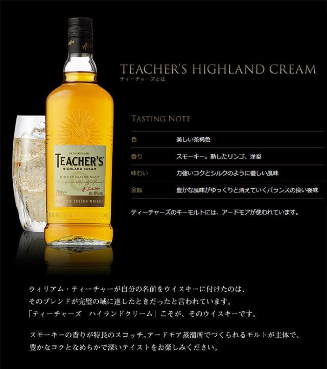 ■度数:40%■内容量:700ml ティーチャーズ先生の帽子をかたどったメジャーカップ付!! アードモア蒸留所でつくられるモルトが主体で、豊かなコクとなめらかで深い味わいが特徴の大人気ブレンデッドウイスキー!! 美しい茶褐色!!スモーキーなアロマに熟したリンゴ、洋ナシといった甘いアロマ!!口に含むと力強いコクとシルクのように優しい風味!!余韻は豊かな風味がゆっくりと消えていくバランスの良い後味!!ハイボールにしていただくことで、スモーキーな香りと、まろやかな味わいがより一層お楽しみいただけます!! |