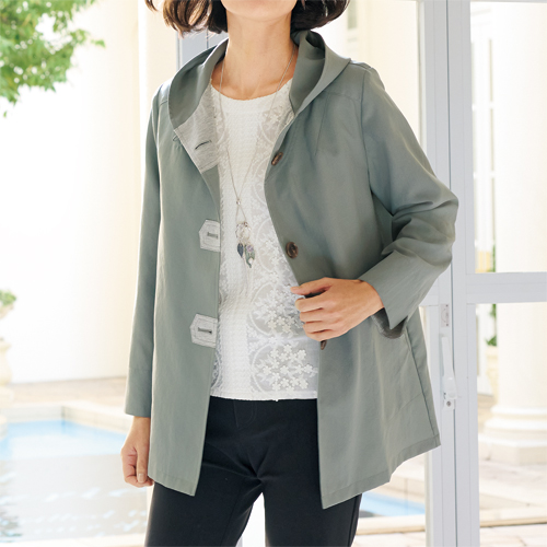 配色デザインジャケット ライトグリーン ライトアウター ジャケット レディース 婦人服 ミセス シニア 女性 飾りフード付き ショート丈 ショートコート スプリング おしゃれ シンプル シニアファッション 40代 50代 60代 70代 80代 90代 母の日 お母さん おばあちゃん 春物 夏物 春夏