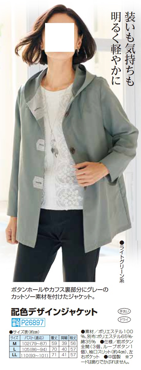 配色デザインジャケット ライトグリーン ライトアウター ジャケット レディース 婦人服 ミセス シニア 女性 飾りフード付き ショート丈 ショートコート スプリング おしゃれ シンプル ファッション 40代 50代 60代 70代 80代 90代 母の日 お母さん 春夏 nss p26897