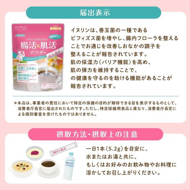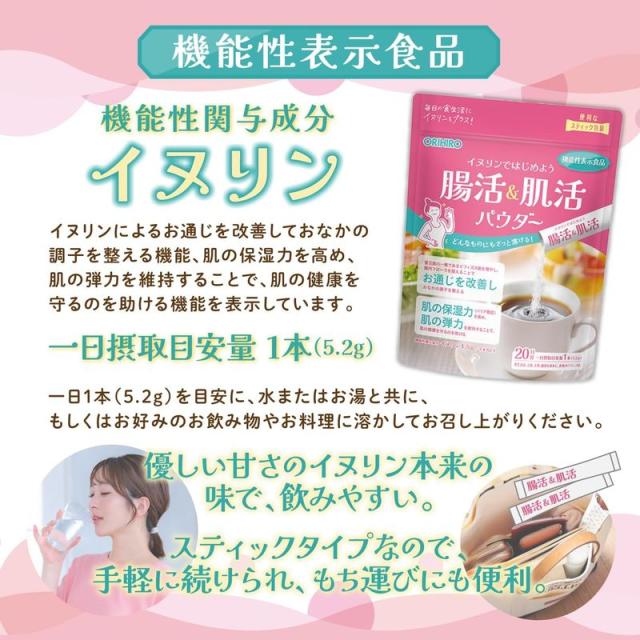 | 検索キーワード | 腸活&肌活パウダー、イヌリン パウダー、機能性表示食品 イヌリン、便通 改善 サプリ、腸内フローラ サプリメント、善玉菌 増やす サプリ、食物繊維 サプリメント、便秘対策 パウダー、スティックタイプ 食物繊維、お腹の調子を整える サプリ、美肌 イヌリン、肌の保湿力 サプリ、肌の弾力 維持 サプリ、乳酸菌×イヌリン、腸活 食物繊維、便秘対策 機能性食品、ダイエットサポート 食物繊維、飲みやすい イヌリン、水に溶ける 食物繊維、オリヒロ イヌリン |