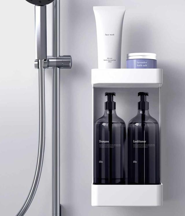 ボトルやフェイスウォッシュなど散らかりがちなバスアイテムをまとめて収納できます。