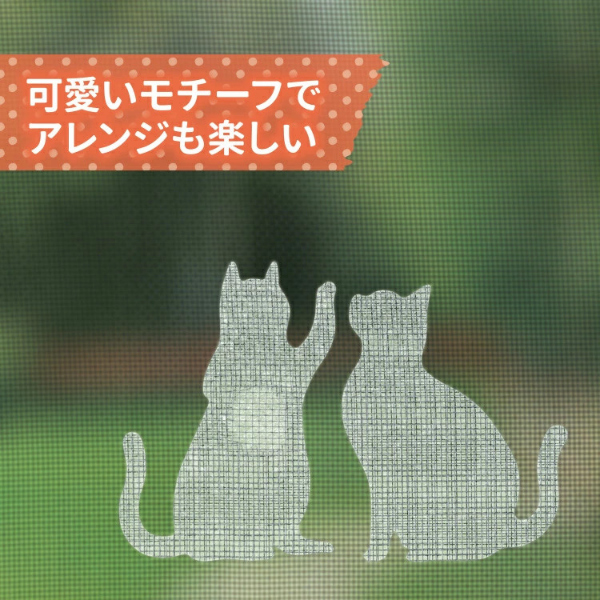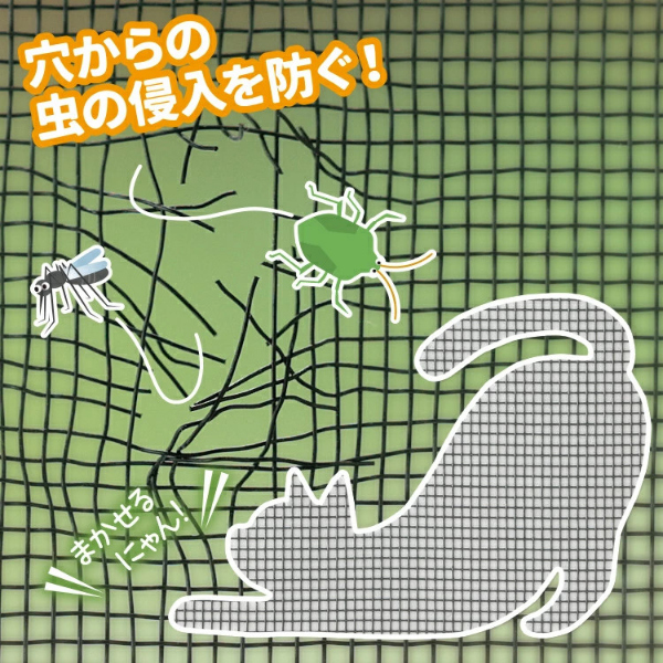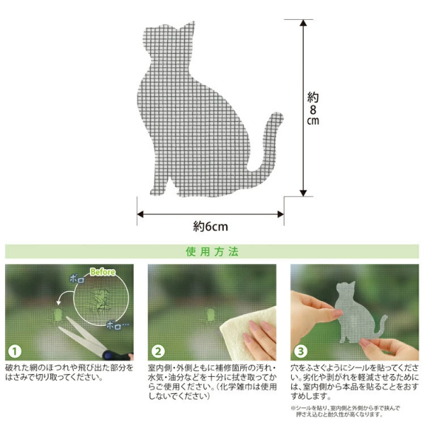 網戸の補修に、網戸に開いた穴にペタッと貼るだけで虫の侵入を防止!■網戸にモノや昆虫などがぶつかってできた穴やキズ。■網戸の劣化による破れは見栄えが悪いだけでなく嫌な虫が入ってきます!■網戸の穴や破れを貼るだけで簡単に補修ができるニャンコの可愛い補修シール。■シールタイプだから切らずに簡単に貼れる。■大きな穴でも2〜3枚並べて貼れば補修完了。■メッシュ柄の耐久性の高いガラス繊維素材。