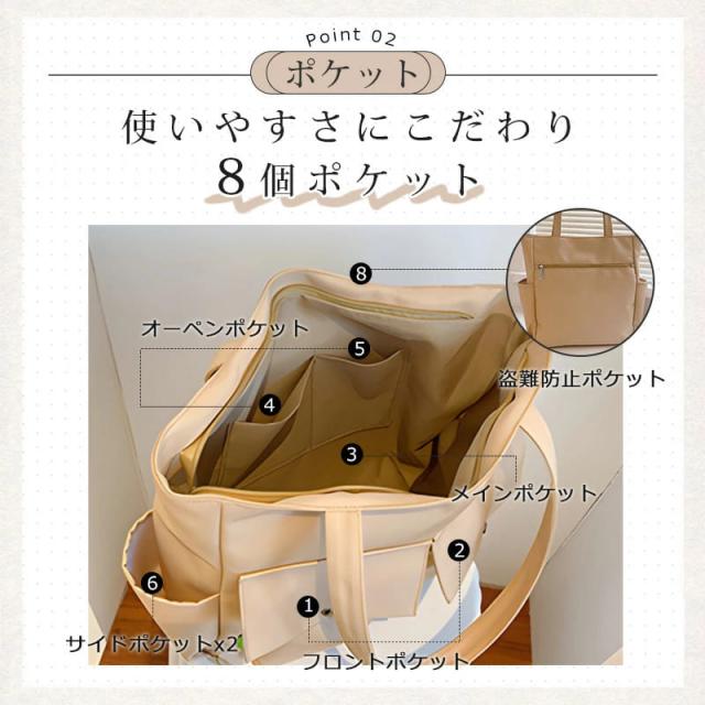 【8ポケット&盗難防止】8個のポケットで収納上手になる。二つのフロントポケット、メインポケット、二つのオーペンポケット、二つのサイドポケット、盗難防止ポケットがある。