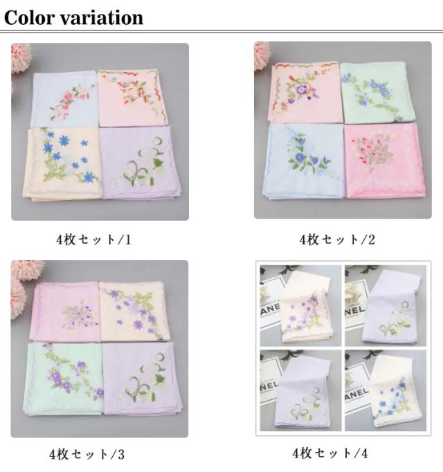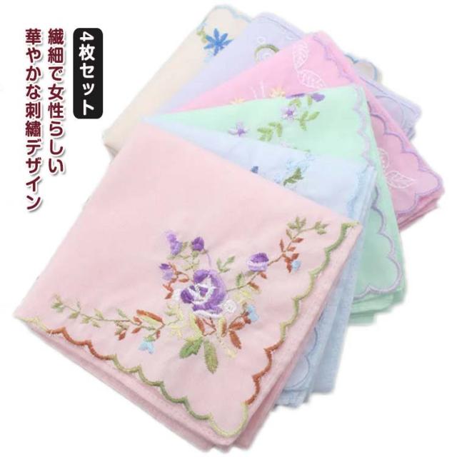 薄手 綿布 4枚セット 大人女性 刺?ハンカチ おでかけ 40×40cm レディース 必需品 アイテム ハンカチ 花柄 ハンカチ 可愛い 刺? 使いやすい カジュアル 夏 汗 吸汗 吸水 速乾 母の日 誕生日 ホワイトデー バレンタイン ギフト プレゼント