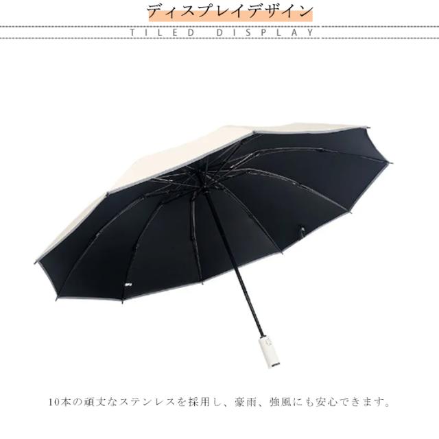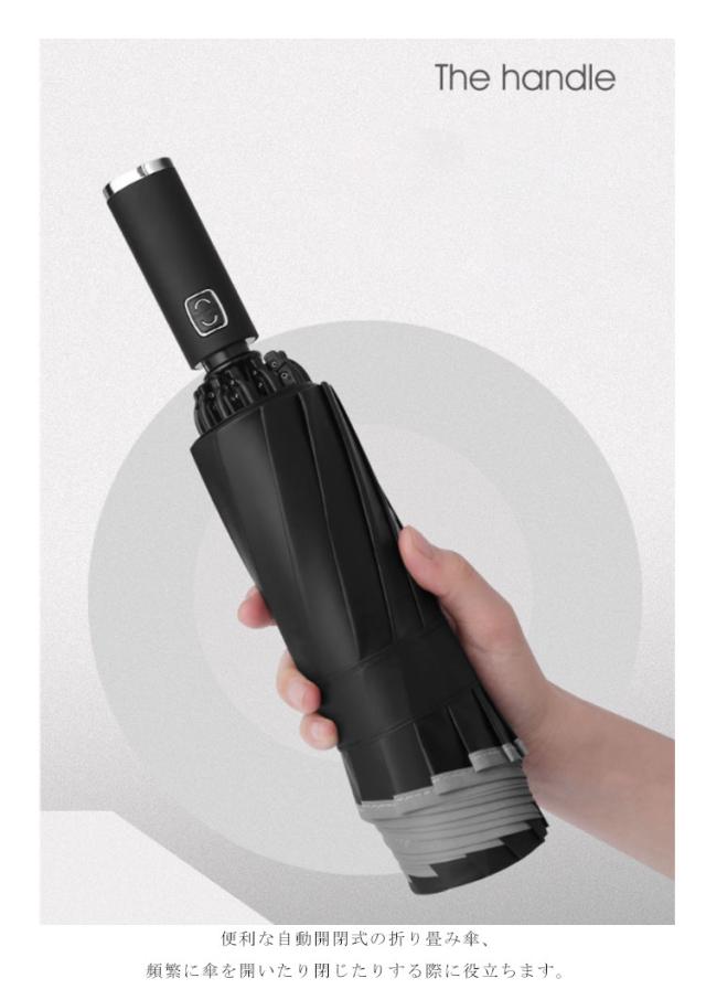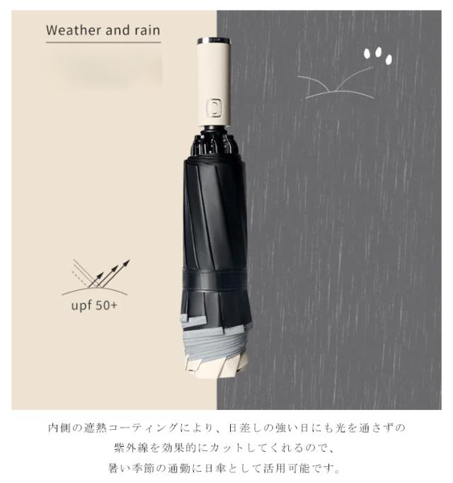 | 閉じると濡れた面が内側になるのでたたむときも移動中も手や服が濡れない折りたたみ傘です。 電車やバスの中で他の乗客を気にする必要もないですし、車に乗る際もシートが濡れる心配がありません。 10本の頑丈なステンレスを採用し、豪雨、強風にも安心できます。 自動開閉機能が備わり、片手でワンタッチ操作できる折りたたみ傘です。 便利な自動開閉式の折り畳み傘、頻繁に傘を開いたり閉じたりする際に役立ちます。 雨の日の車の乗り降り、子供を抱いている時や荷物の多いときも楽。 内側の遮熱コーティングにより、日差しの強い日にも光を通さずの紫外線を効果的にカットしてくれるので、暑い季節の通勤に日傘として活用可能です。 天候にかかわらず、浸透防止と99%以上UVカットでき、一年中活躍してくれる晴雨兼用の折り畳み傘です。 シンプルデザインでビジネス時からカジュアルな服装にも合わせやすい、男女老若を問わず、通勤、通学、旅行、出張などの場合がご利用できます。 | |
