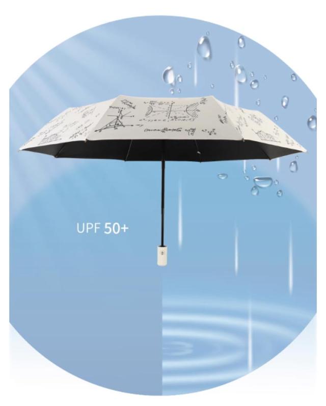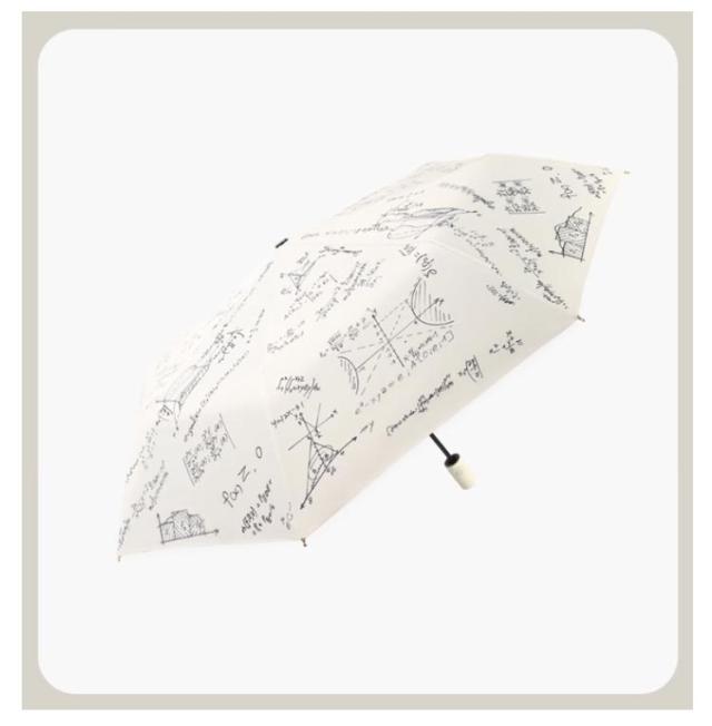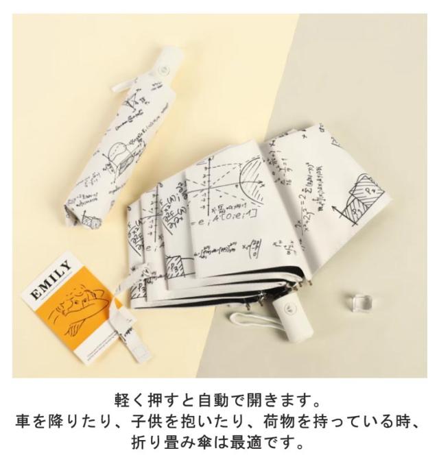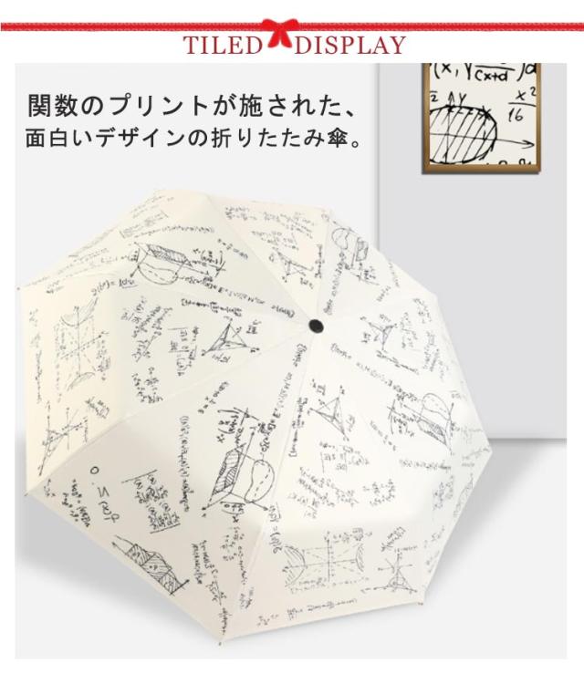 | 関数のプリントが施された、面白いデザインの折りたたみ傘。 軽く押すと自動で開きます。車を降りたり、子供を抱いたり、荷物を持っている時、折り畳み傘は最適です。 特殊なコーティング加工を施した生地を使用しており優れた紫外線防止効果で、UVカット率99.9% 以上。 紫外線もしっかりカットするので、晴雨兼用で使えます。 | |