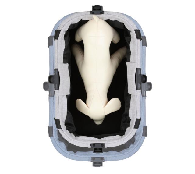 別売のカーシートプロテクションと付属の肩ストラップを使用することで、キャビンを車のシートに留めることができます。
