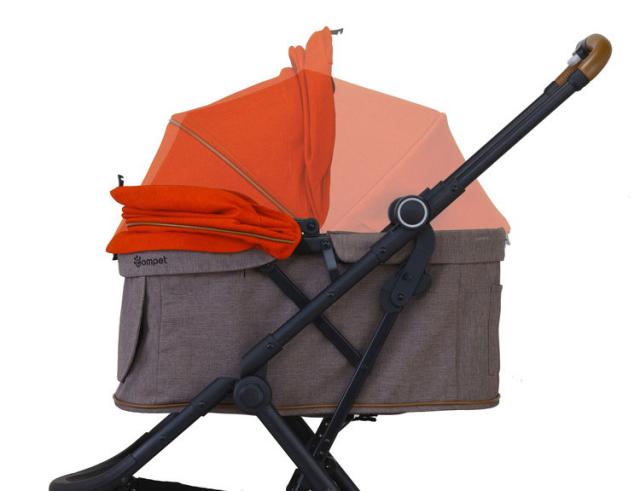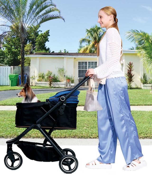 太陽の向きに応じて開ける方向を変えたり、ペットと向かい合った状態でカートを押すことができるなど、シーンに合わせて便利にお使いいただけます。