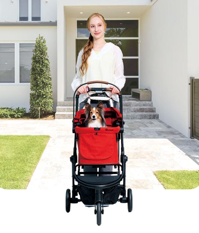 太陽の向きに応じて開ける方向を変えたり、ペットと向かい合った状態でカートを押すことができるなど、シーンに合わせて便利にお使いいただけます。