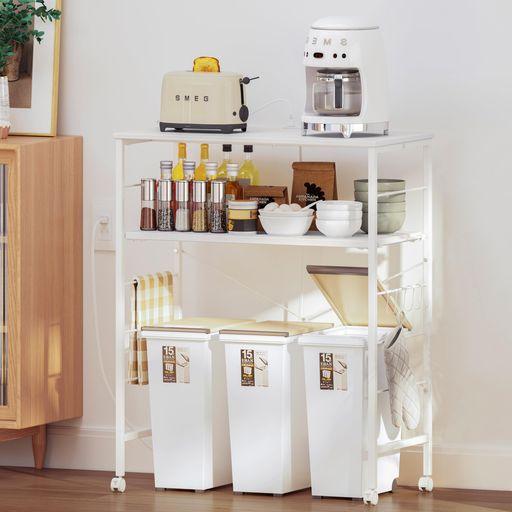 【使用シーン】キッチンの収納はもちろん、プリンター台としても活用ができる多目的アイテムです。場所を取らず収納スペースが効率的に確保でき、レンジ上のデッドスペースを活かせるので、棚板下部にごみ箱をすっぽり収納し、すっきりとしたキッチンが実現できます。スチールフレームと木製板のコンパクトデザインで、ワンルームや狭いキッチンの方はもちろん、プリンターの置き場所に困っている方におすすめです。