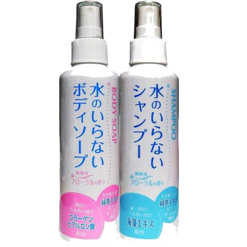 どこでも水なしで簡単に頭皮や肌のニオイや汚れをふきとる「水のいらない」シャンプーとボディソープの2種類各1本セット 災害時に水が使えない、気軽に入浴できない、病気やケガをした時など、防災・緊急用品として備蓄しておくことができます。 アウトドアでシャワーができない、汗をかいたスポーツの後や猛暑の外出先でもさっぱりしたい等、普段の用途にもお使いいただけます。 天然ヤシ油由来のアミノ酸系洗浄成分や保湿成分を配合し、緑茶エキスが肌を整え、頭皮や肌にやさしいのが特長です。 微香性フローラルの香りが気になるニオイを抑えてすっきり爽快。シャンプーはトロミのある無色透明な液体タイプ、ボディソープは化粧水のような使用感の液体タイプです。ノンアルコール・ノンメントールなので刺激や乾燥を与えず、お子様やお年寄りにも安心です。