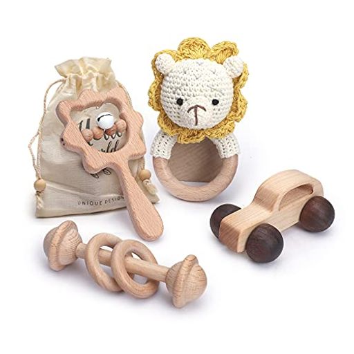 LET‘S MAKE ガラガラ ラトル 木製ミニカー 木のおもちゃ 獅子 4点セット おもちゃ 赤ちゃん 木製 無塗装 幼児 手押し車 ギフト 出産祝い 知育玩具