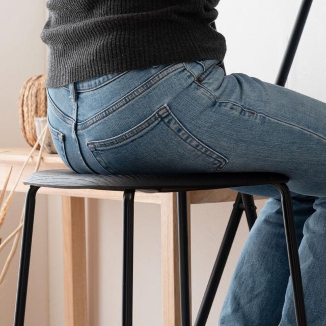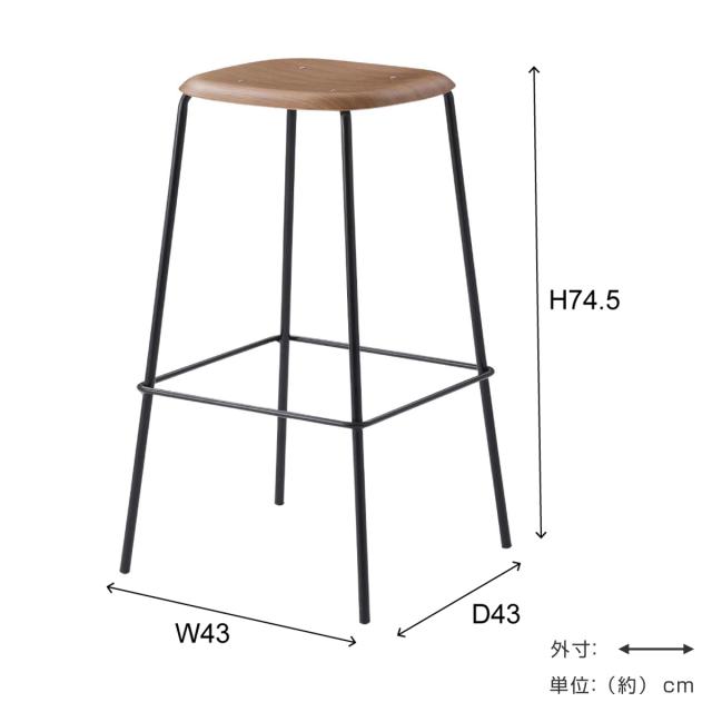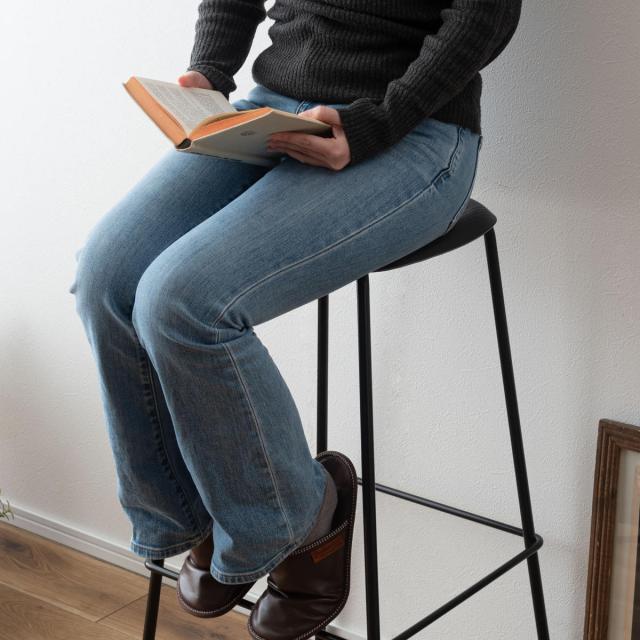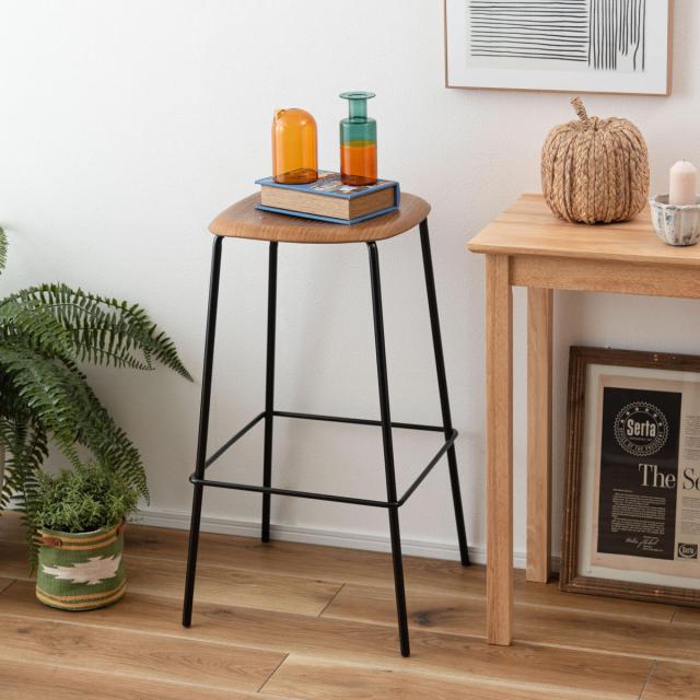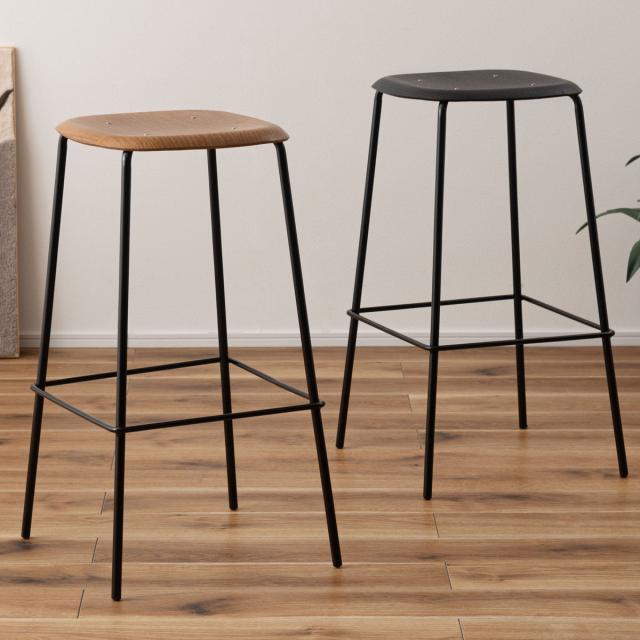 無駄な装飾のないシンプルなデザインの板座タイプのハイスツール。座面下から伸びたスチール脚の細めのラインと四角形に描かれたステップがスタイリッシュな印象です。
