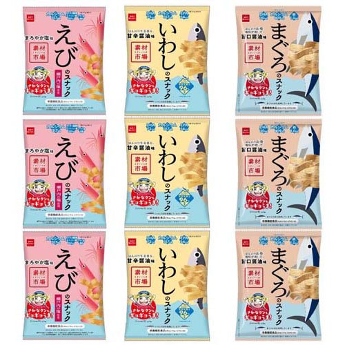 | 素材市場いわしのスナックほんのり生姜香る、甘辛醤油味:61g×3袋、素材市場まぐろのスナックほんのり山葵風味が効いた、旨口醤油味:61g×3袋、素材市場えびのスナックまろやか塩味:61g×3袋 計3種9袋 |