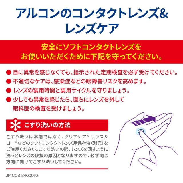 ・クリアケア消毒液で装用前のレンズのこすり洗いやすすぎをしないでください。中和されていない消毒液でこすり洗い又はすすいだレンズを装用すると、ヒリヒリと刺すような痛みが生じます。レンズをすすぐ場合には、必ずクリアケアリンス&ゴーなどのソフトコンタクトレンズ用保存液(別売)をご使用くたさい。