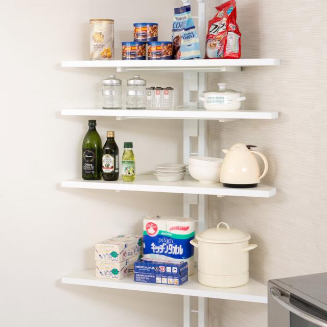 4枚の棚板は、9cmピッチ20段階と細かく調節できます。取り付け、取り外しが簡単なので、収納したい物に合わせていつでも高さを変えられます。国内で製造されたラックは、しっかりと金具でセッティングするので強度抜群です。
