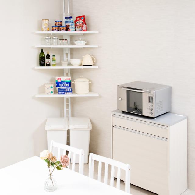 デッドスペースになりがちなお部屋の角も収納スペースとして活用できます。空間を広く使えるので、お部屋がすっきり片付きます。壁を傷付けることなく設置できる突っ張り式で、賃貸住宅にお住まいの方にもおすすめです。