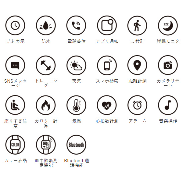Bluetooth通話機能・血中酸素・GPS・懐中電灯・気温・時計アナログ表示・トレーニング・生理測定 ・電話着信・防水・アラーム・SNS通知・スマホ探し・天気・カメラリモート・歩数・距離・カロリー・睡眠・心拍・座りすぎ注意・音楽操作・カラー液晶