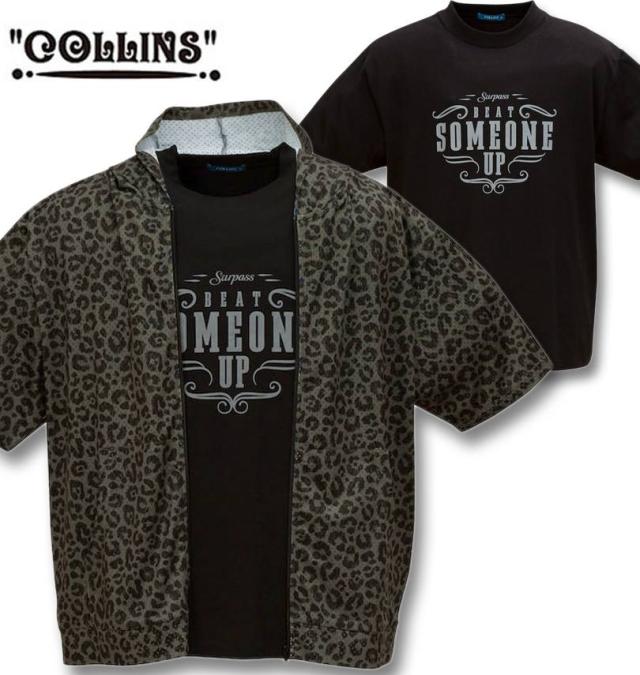 大きいサイズ COLLINS メッシュ ヒョウ柄 半袖フルジップパーカー+半袖Tシャツ チャコール×ブラック 3L 4L 5L 6L 8L/1258-5231-2-69