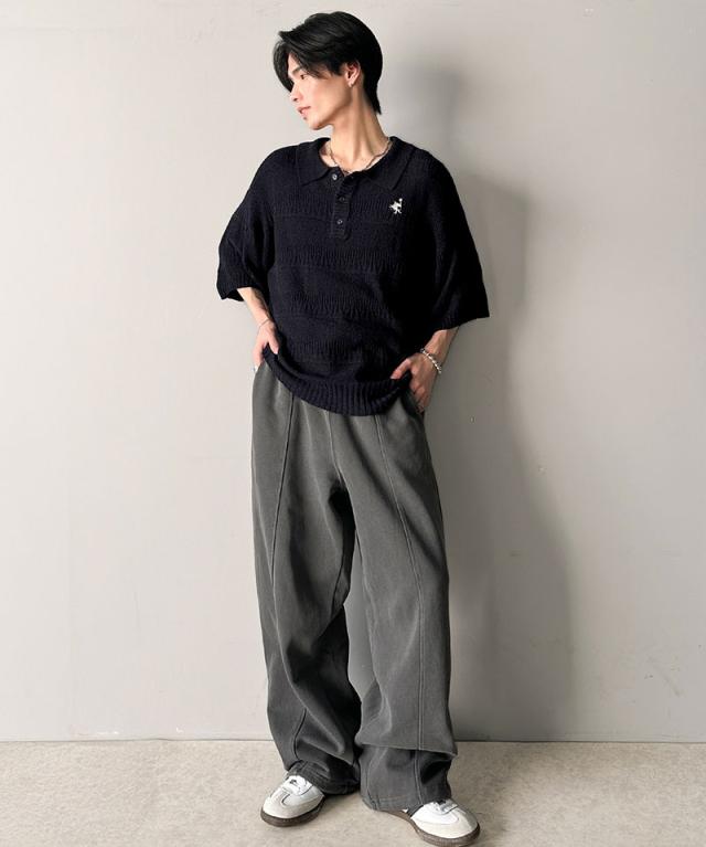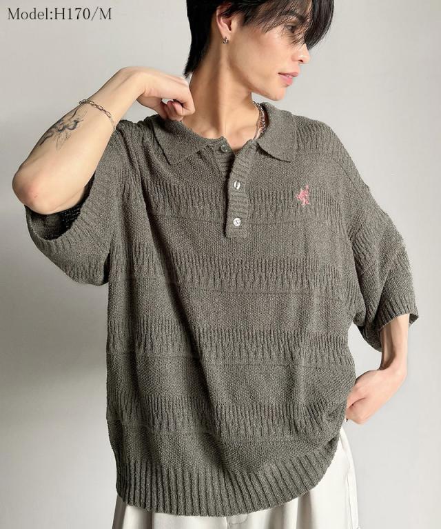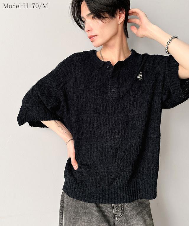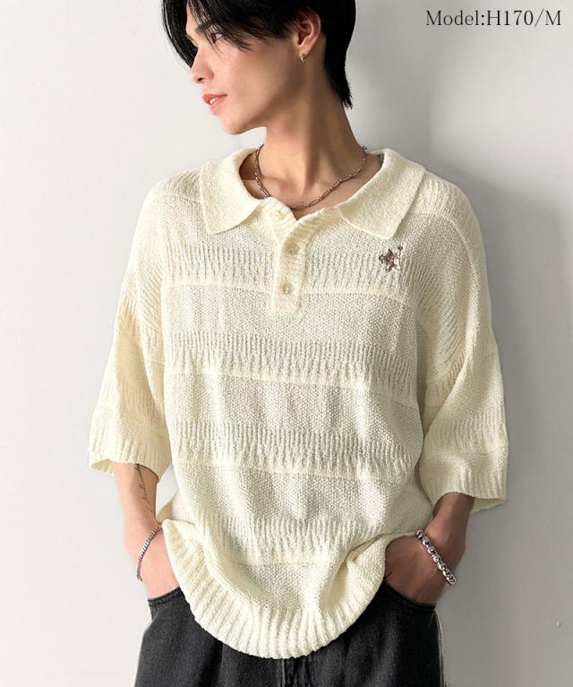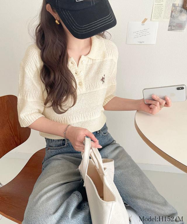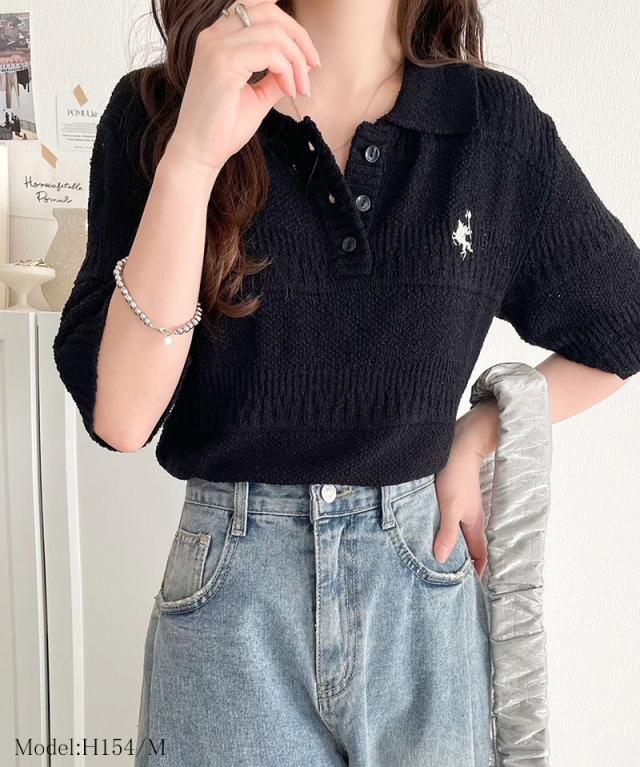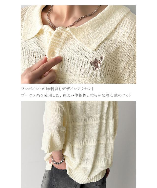 ★一枚で大人のラフスタイルが決まる。ワンポイント刺繍ブークレポロニットトップス(半袖)★