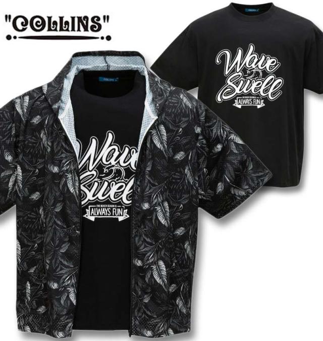 大きいサイズ COLLINS メッシュ リーフ総柄 半袖フルジップパーカー+半袖Tシャツ ブラック×ブラック 3L 4L 5L 6L 8L/1258-5230-2-69