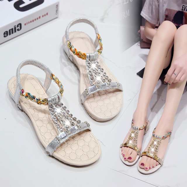 サンダル レディース ビジュー 装飾 ラインストーン ゴムバンド ボヘミアン アンクル ストラップ ローヒール 3cmヒール フラット キラキラ 滑り止め 華やか 存在感 柔らかい 履きやすい 歩きやすい 大人 かわいい おしゃれ 通勤 通学 学生 お出かけ デート リゾート 休日